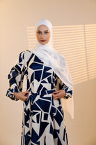 Turn heads with the sophisticated elegance of the Navy Mosaic Luxe Dress. This long satin ensemble features a striking navy and cream geometric pattern that creates a flattering, sculpted silhouette. Designed with a matching belt for a contoured, cinched fit, it effortlessly blends structure with fluidity. The bishop sleeves add a soft, graceful touch, while the included belt offers a contoured, flattering fit. Fully lined and non-sheer, it offers both confidence and comfort. Perfect for formal occasions, this set embodies refined luxury in every detail.